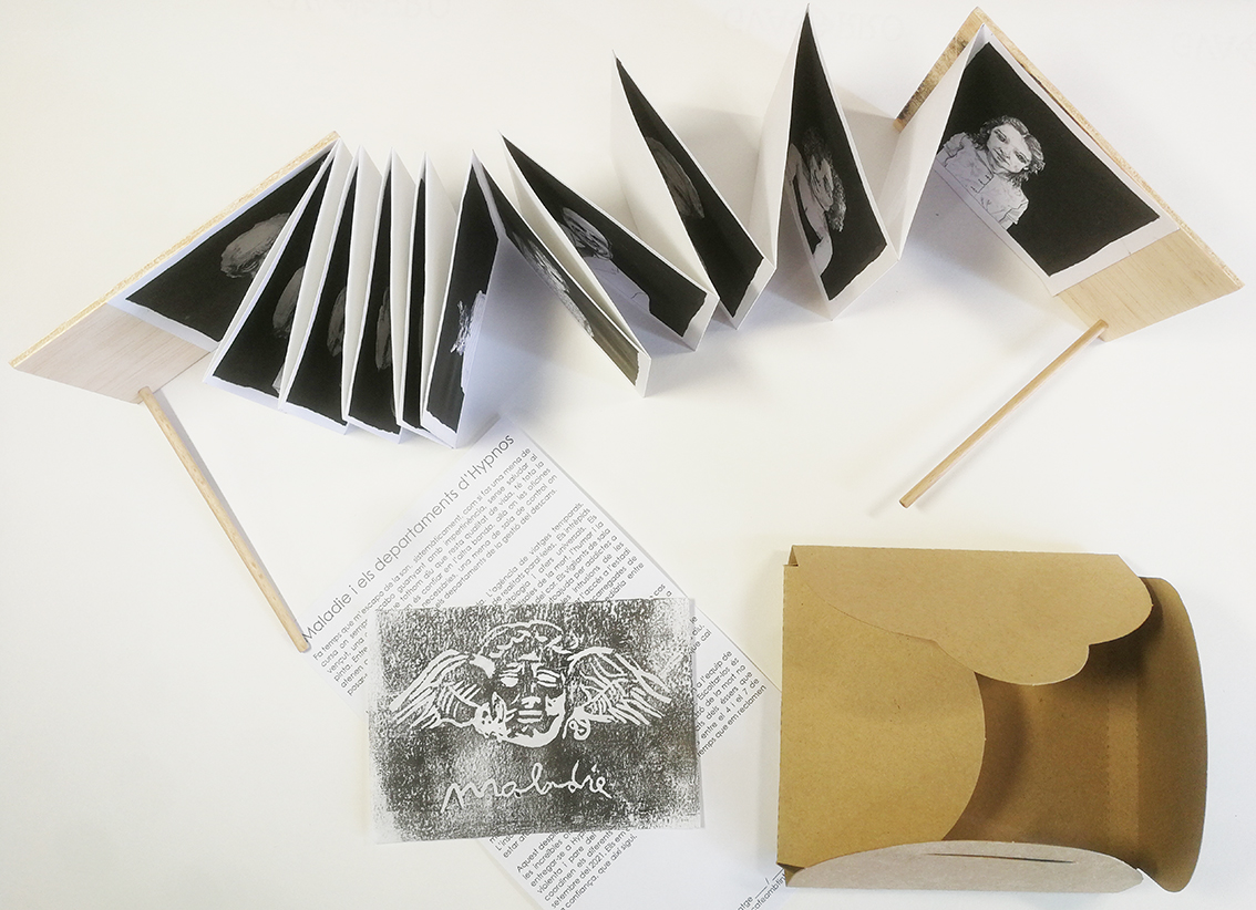 maladie és un exorcisme, una oportunitat per parar atenció al que el mal ens digui, un espai on escoltar l’equip d’Hypnos i les increïbles oficines de la son, la meva i, si vols, la teva. Hypnos és fill de la nit i l’ombra, germà bessó de la mort no violenta i pare del somni. Aquesta publicació és fruit de tres nits d’insomni on vaig dibuixar els 20 éssers que coordinen els diferents departaments d’Hypnos. La publicació és un acordió de dos metres que recull una còpia reduïda de vint retrats fets a tinta, amb dos gravats originals d’Hyipnos, un a paper i l’altre sobre la coberta fusta.