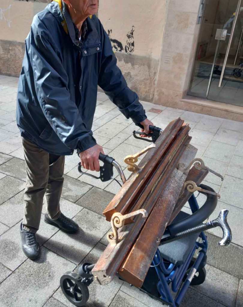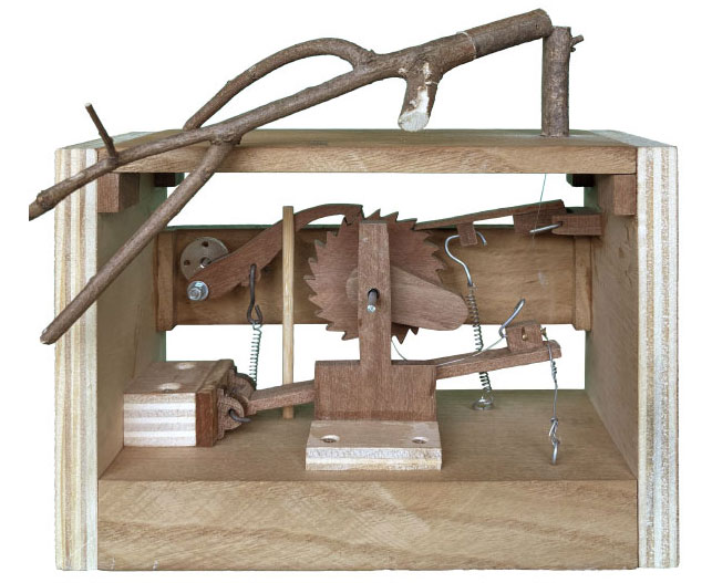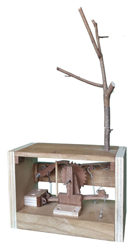 El 5 de maig del 2023 vam trobar unes baranes de fusta dins un sac de runa davant de la floristeria Sagalà de Sabadell, estaven de trasllat, fusta de qualitat que vam carregar cap al taller. Un any després les baranes van transmutar en una sèrie d’engranatges, un petit mecanisme encaixat en un marc de 21,5x10x15 cm. Només cal donar-hi 22 voltes seguint les agulles del rellotge per fer reviure una branca, tantes vegades com sigui necessari. El bosc es va recuperant.